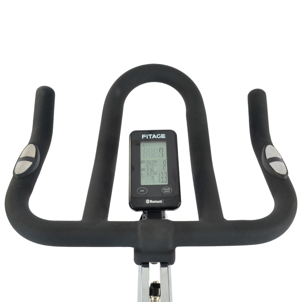 La Bicicleta para spinning FITAGE STRONG 860 posee una rueda de inercia de 20 kg y freno por fricción. Cuenta con Bluetooth, lo que permite participar de competencias online mediante Apps, asi como tambien pedalear en circuitos virtuales. Este equipo es ideal para un entrenamiento profesional. Su computadora mide scan, tiempo, velocidad y distancia. El manubrio es ajustable en altura con grip antideslizantes, pedales con puntera y traba de emergencia para resguardar la seguridad del usuario. Sus ruedas de traslado garantizan una fácil movilidad del equipo.